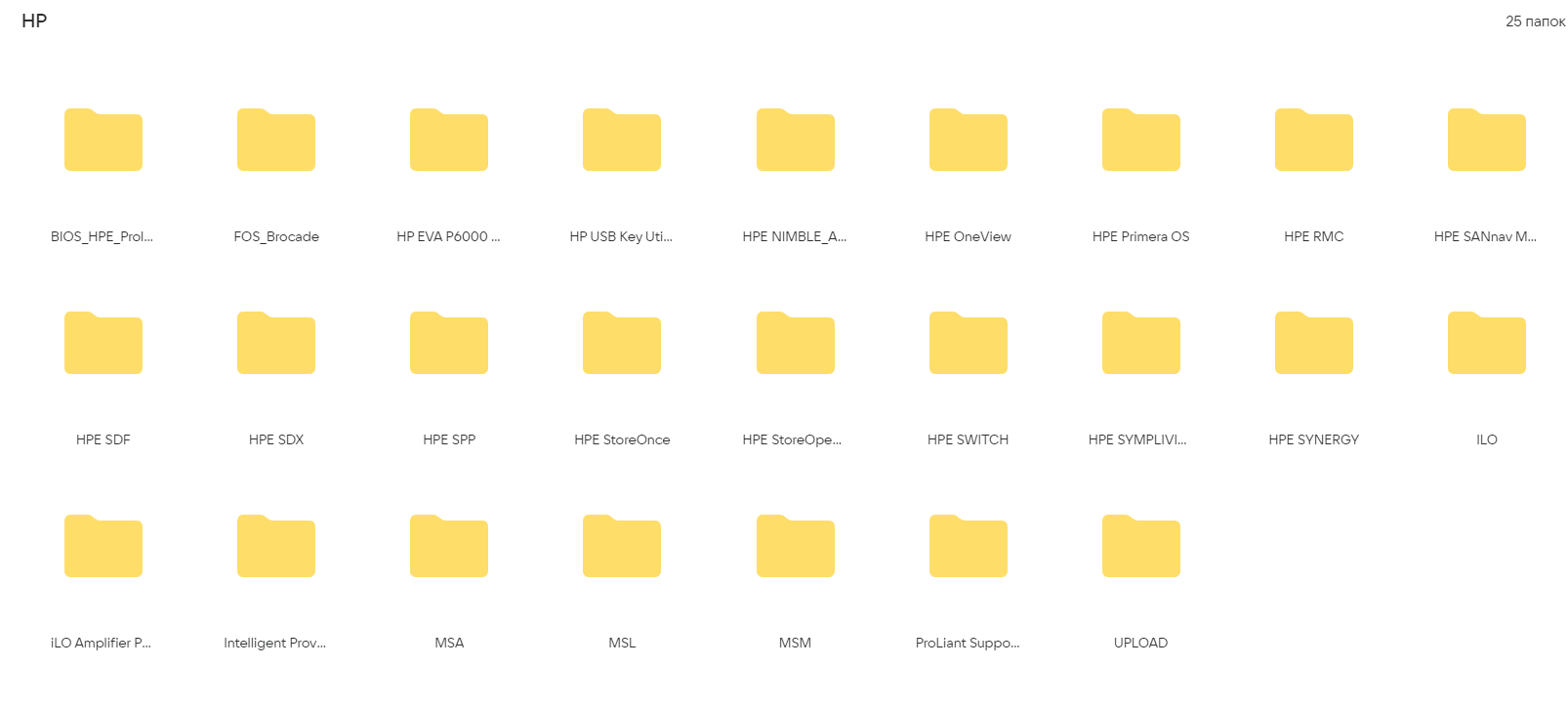 Каждая папка предназначена для отдельной категории оборудования или программного обеспечения, связанного с серверами HPE (HP Enterprise). Это помогает быстро находить нужные драйверы или утилиты для конкретного оборудования.
